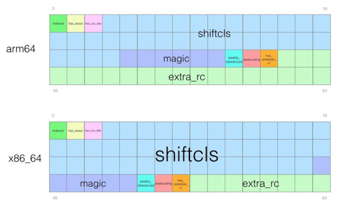 我们前面也讲到,nonpointer的isa指针可以存储很多额外信息,并且其存储信息的内存布局是跟架构有关的,下面这张图可以很形象地将该布局给展示出来:
