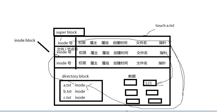 当文件被创建时,首先找到的是其根目录的 i 结点,再通过指针找到 directory block 中的文件 i 节点,如果没有则新建,新建好之后再把数据存储到相应位置。