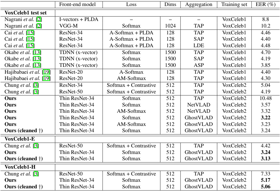 表3:在原始VoxCeleb1测试集上的验证结果。所有模型都采用了相同的Thin Resnet-34结构,并且变化VLAD clusters数目和loss函数。