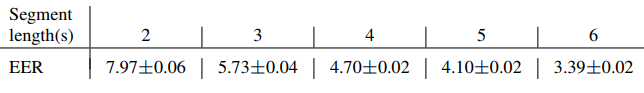 表4展示了不同测试数据段长度对SR性能的影响。为了对最长6秒的长度进行充分比较,文章中将测试数据集(VoxCeleb1)限制为6秒或更长(87,010个片段,占总数据集的56.7%)。为了生成验证对,对于VoxCeleb1数据集中的每个说话者(总共1251个说话者),随机抽取100个正对和100个负对,得到25,020个验证对?测试期间,每个验证对,随机裁剪出长度为2s、3s、4s、5s和6s的片段。实验重复三次,并且计算均值和标准差。