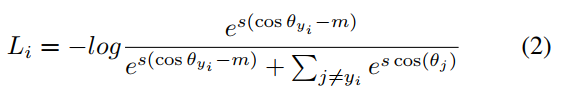 其中Li指的是样本被分类到正确类的成本,θy = arccos (wTx) 是指样本特征(x)和决策超平面(w)之间的角度,这两个向量都已经被L2正则化。目的是通过使cos(θyi)−m尽可能大,来最小化这个角。其中m指的 angular margin。超参数s控制着softmax loss的“temperature”,对分离得好的样本,产生更高的梯度(并进一步缩小类内方差)。文章采用默认值m=0.4和s=30。