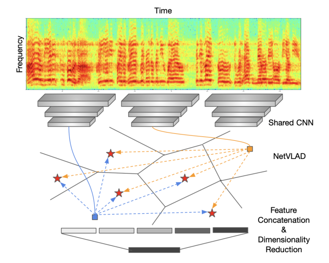 图1:文中的网络结构。由两部分构成:特征提取(a shared CNN用于对spectrogram进行编码)+聚合(aggregates为local descriptors为不定长度的单一紧凑表达)