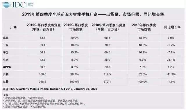 2019年,据IDC公布的中国手机排行显示,OPPO排在小米后位居第五,而到了2020年,OPPO却仍然排在小米后位居第五。