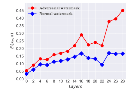 作者提出了一种新的对抗样本算法Adv-watermark。水印同时具有水印特性(版权保护)和对抗样本的功能(导致训练好的模型误分类),需要注意的一点在于除了水印区域并没有其它的对抗扰动。