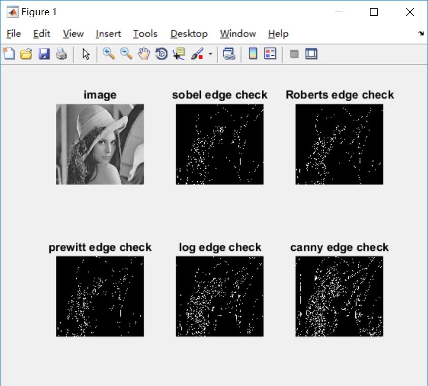 将上述代码复制到Matalb里,把图像地址改成自己想要提取边缘的图像,运行之后便可的得到图像边缘。小白在自己的电脑上运行程序的结果如下图。在程序里也利用其他算子提取了边缘,方便小伙伴的对比。
