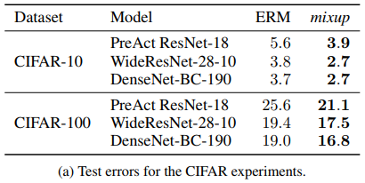 虽然极其简单,但是在CIFAR10/100, ImageNet2012上都取得了最好的结果,对于欺骗性的label或者对抗样本也更具有鲁棒性,在语音任务上和列表数据上提升了泛化性能,可以稳定GAN的训练过程