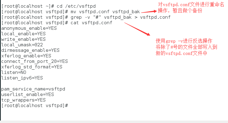 因为vsftpd.conf中注释太多,不便于我们查找配置,所以使用grep将文件进行过滤