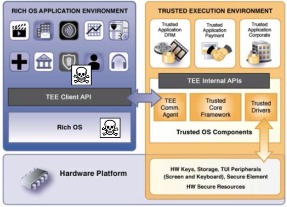 1.TEE(可信执行环境):这是一种安全协议,它在硬件(包括芯片)、OS、软件单个层面提出了规范来保证安全可信。