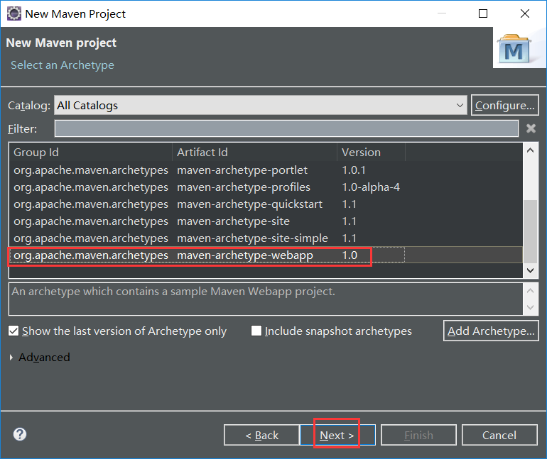3.创建web项目,必须选择maven-archetype-webapp,其他选项默认;