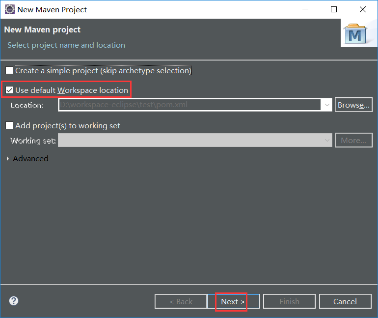 2.设置要创建的maven项目的保存位置,使用默认项;