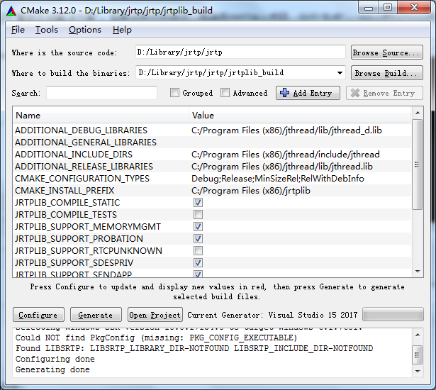 确认无误再点一次configure,最后点:generate,生成VS2017工程文件: