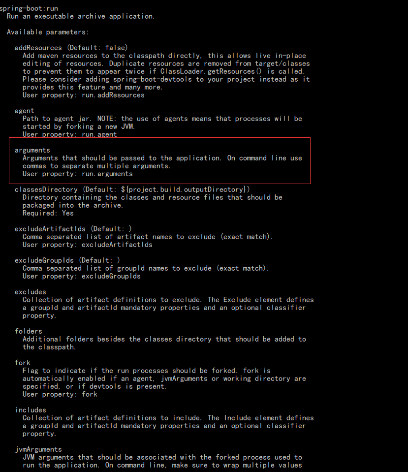 spring-boot:run该maven查件在插件首页中指定了相关能够使用的可选参数: