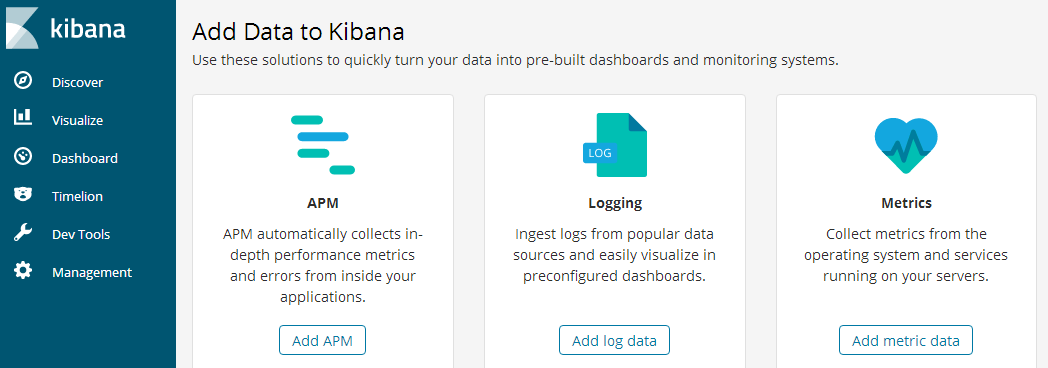 打开浏览器,输入:http://<your-host>:5601,看到如下界面说明安装成功