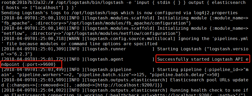 再次执行:看到:Successfully started Logstash API endpoint {:port=>9600} 即可