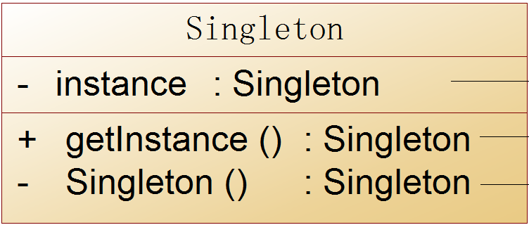下面是单例模式的UML图。(注:UML-Unified Model Language 统一建模语言,又称标准建模语言。是用来对软件密集系统进行可视化建模的一种语)