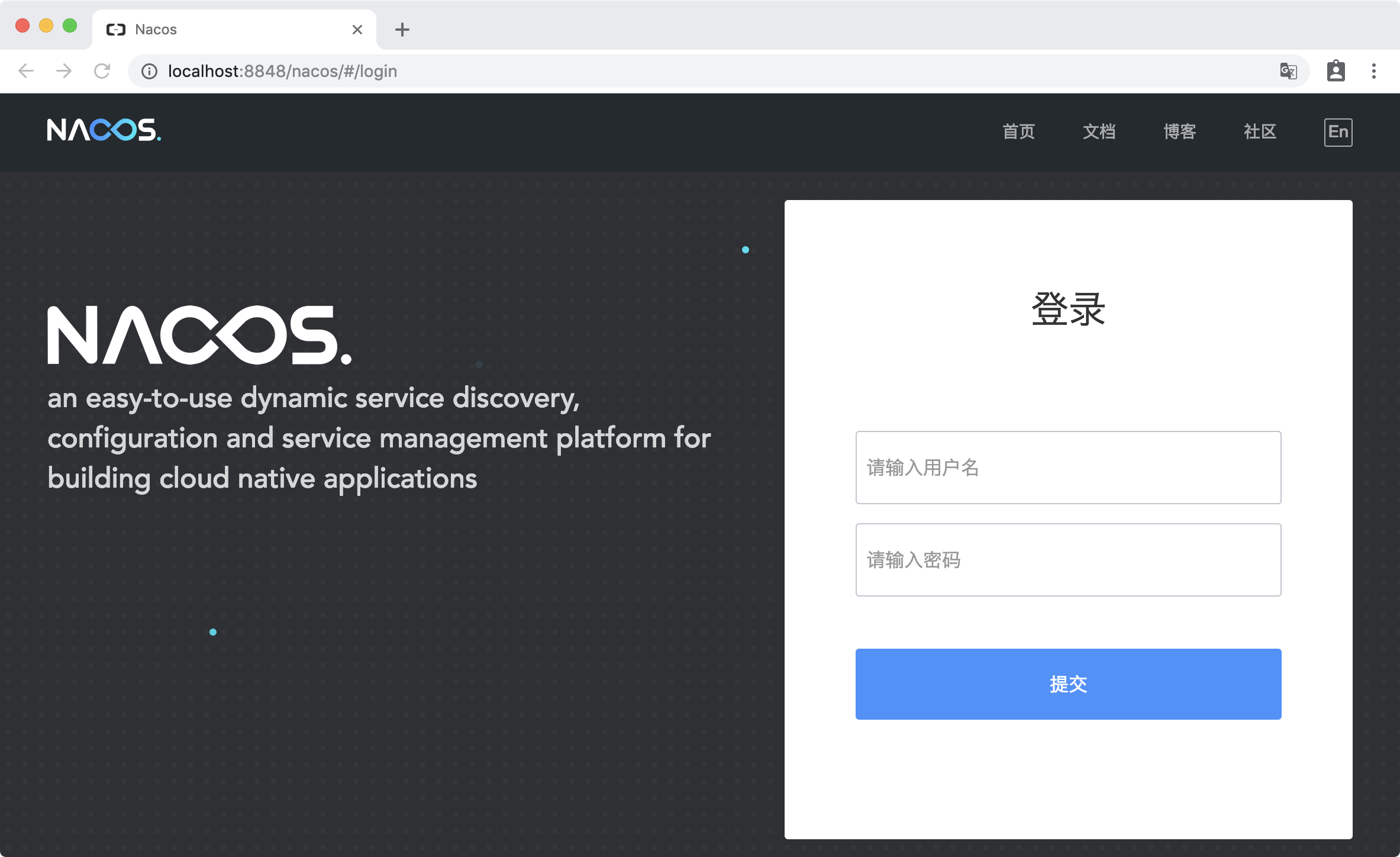 启动成功后,访问Nacos服务,http://localhost:8848/nacos/#/login,默认情况用户名密码都是nacos,登录页如图所示。