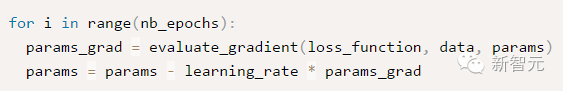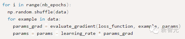 epochs 是用户输入的最大迭代次数。通过上诉代码可以看出,每次使用全部训练集样本计算损失函数 loss_function 的梯度 params_grad,然后使用学习速率 learning_rate 朝着梯度相反方向去更新模型的每个参数params。一般各现有的一些机器学习库都提供了梯度计算api。如果想自己亲手写代码计算,那么需要在程序调试过程中验证梯度计算是否正确。