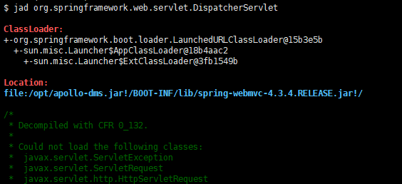 jad org.springframework.web.servlet.DispatcherServlet # 直接反编译出java 源代码,包含一此额外信息的