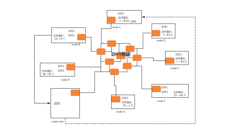 接下来一个新的节点 node new 上线了。如果想下载文件 1,它首先要加入 DHT 网络,如何加入呢?