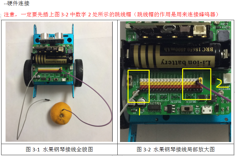 1. 用左手握住接GND的一根线,将橘子通过导线连接到P1口,右手触摸橘子,发出一种声音;
