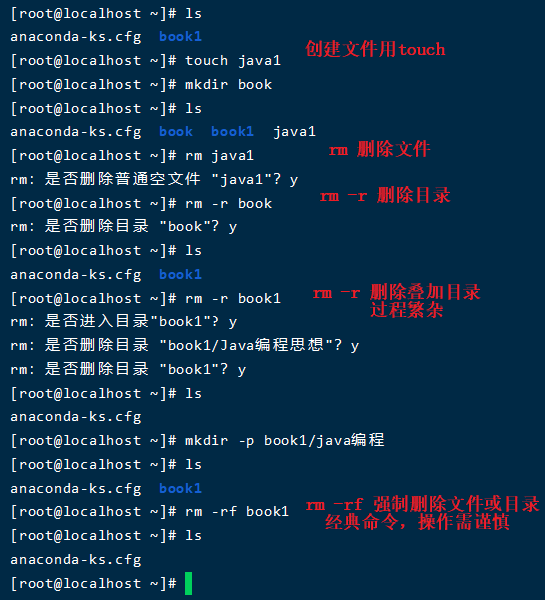 删除文件或目录 rm -rf; 删除空目录 rmdir;