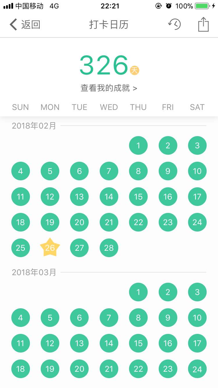 ##扇贝单词 我从2016年6月开始使用扇贝单词背单词,但那时只是想起来就背,应该从来就没有满勤打卡的时候。真正把背单词这件事坚持下来,应该是从2017年6月开始,逐渐打卡记录多了起来,第一个满勤打卡发生在2017年8月。我每天要求自己背50个单词,大概10分钟左右的时间。我将背单词的时间固定在每天早上上厕所的时候同时进行,别人上厕所刷朋友圈,看电视剧,我就背单词。如果上厕所的时间背不完,我就上班坐轻轨的路上把剩下的单词背完。从上轻轨到下车,15分钟左右,一定可以背完本天的任务。一开始自己督促自己背很难,忘记是很正常的,这也就是为什么2017年6月份到7月份我没有整月满勤。应该是从8月份开始,我就固定了背单词的时间,所以每天基本上都可以完成任务。
