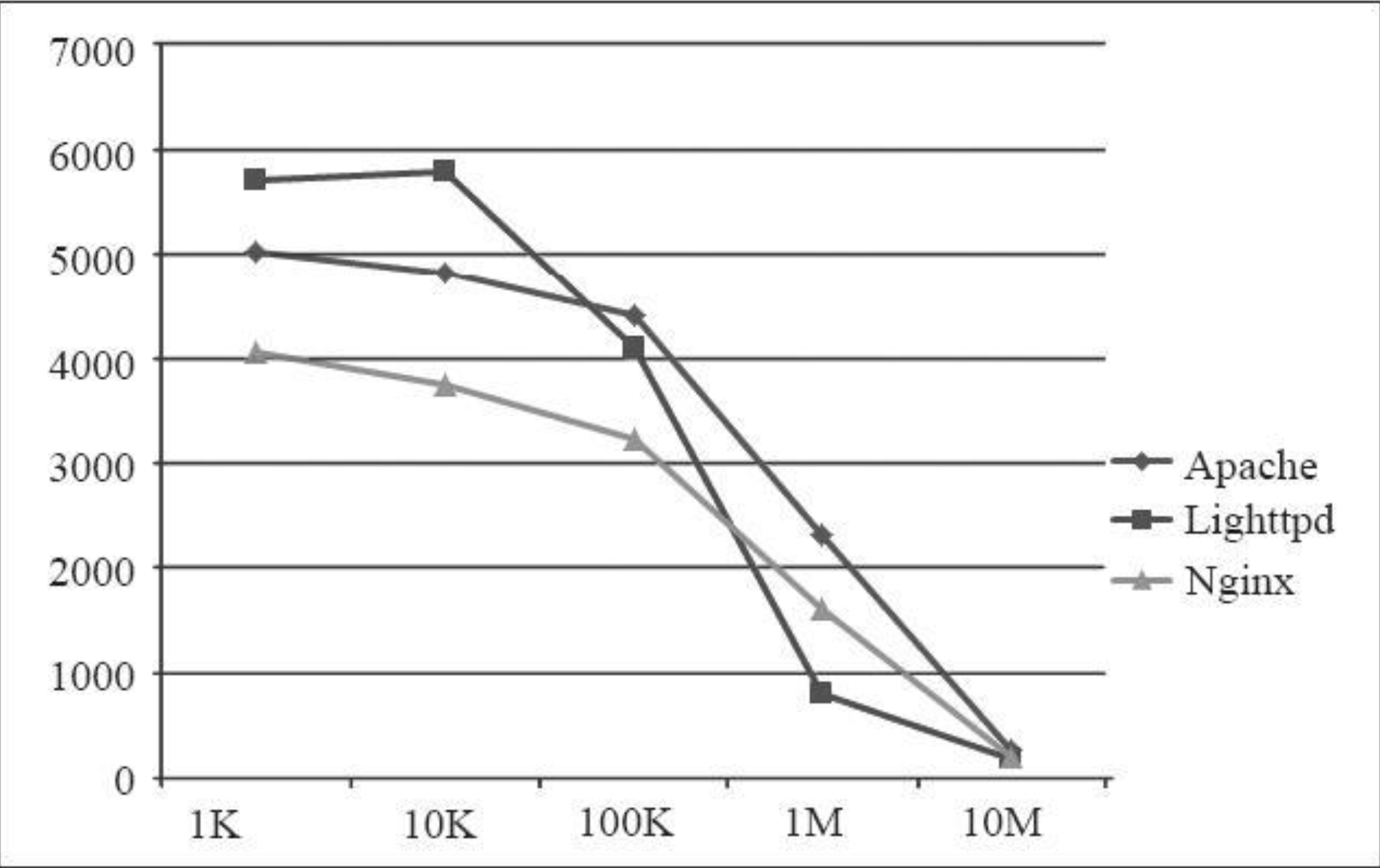 从下图中可以看出处理静态小文件(小于1MB时),Nginx和Lighttpd比Apache更有优势,Nginx处理小文件的优势明显,Lighttpd综合最强。