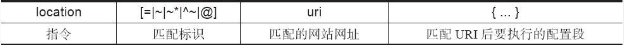 | 3 | " loction ~* \.(gif | jpg | jpeg)$ { " | 正则匹配,*为不区分大小写 |