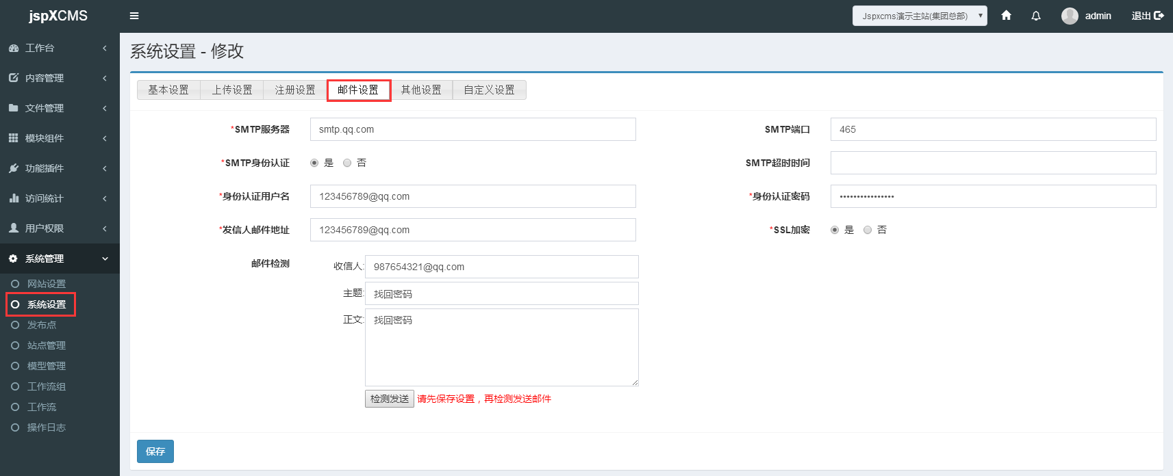 然后到系统后台,在“系统管理” - “系统设置” - “邮件设置”中进行设置。