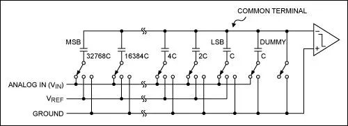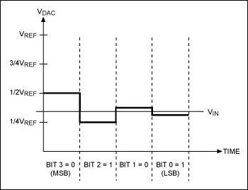 每个时钟沿,比较器对电容上的电压和地作比较, 由此结果来决定下一个电容是否接入电路。