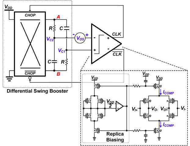 用本身的时钟做chopping改善flicker noise,抵消offset;swing booster的高通行为使时钟信号上升沿变陡,一定程度抑制了噪声电压与抖动的转换。