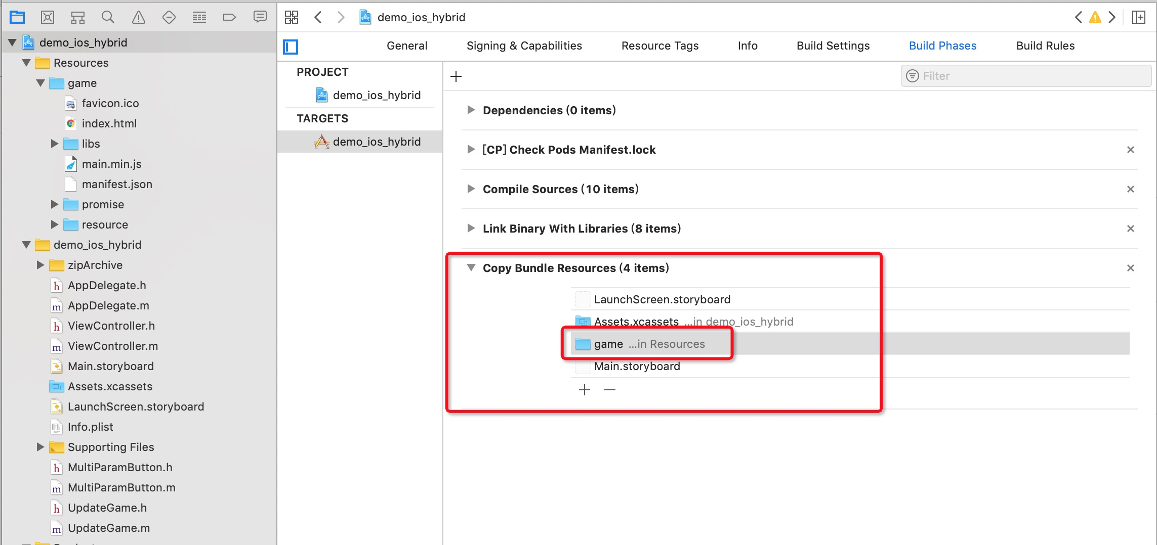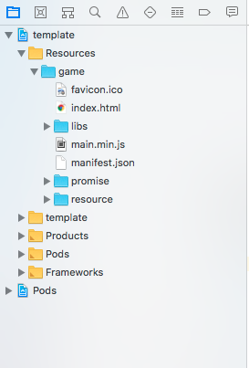 如下图所示,indexFilePath为”game/index.html”。需要确认游戏资源目录已经添加到”Copy Bundle Resources”中。