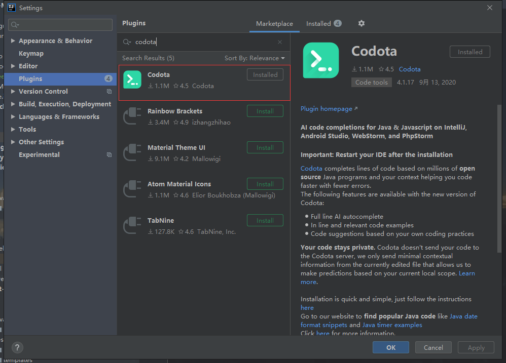 这个插件其实是一个偷懒神器,但是争议性很强。他的功能主要是代码自动补全,根据你的代码上下文来给予整行的代码建议,比idea自带的提示还要详细。(但是他是基于海量代码的实例来自动推荐的,那会不会有代码泄露问题呢?好用是好用,如果公司不让用,那咱就不用昂)