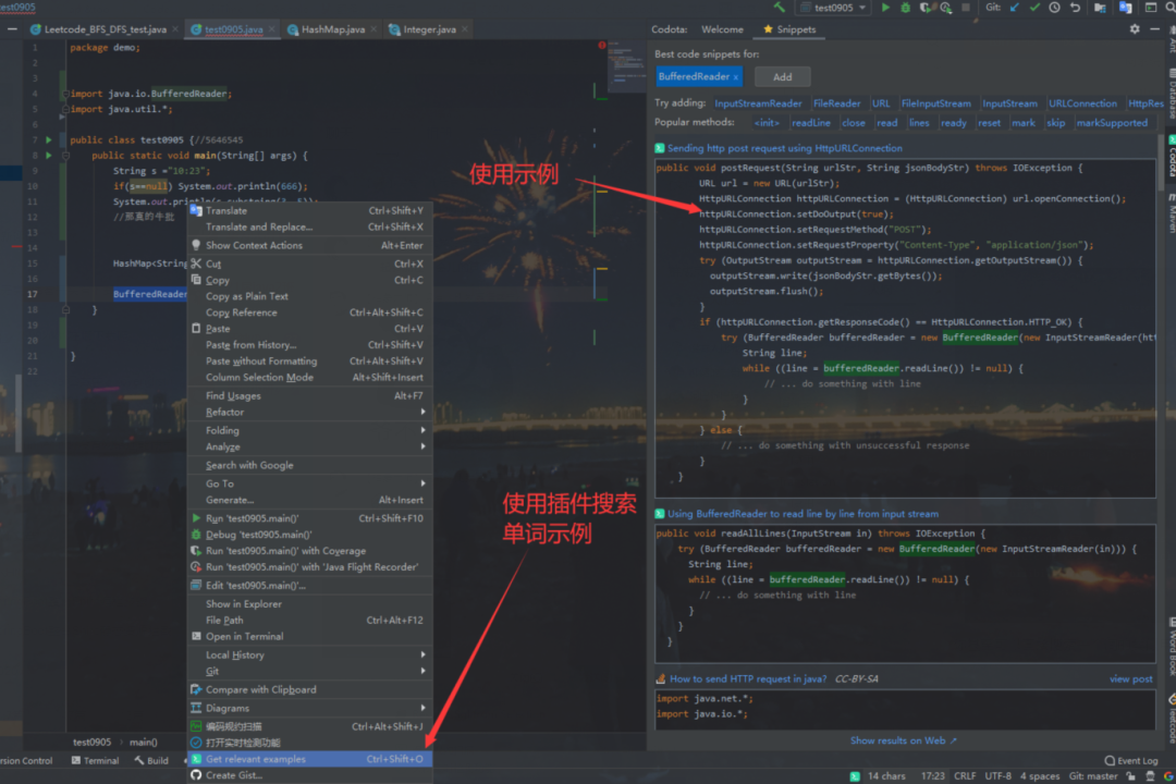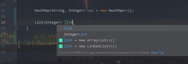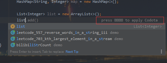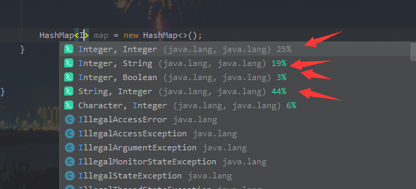 安装以后,日常coding即可发现。这里有五项是codota推荐的,其中HashMap<String,Integer> 使用率高达44%,基于大数据发现,大家用map存这个键值对类型的最多