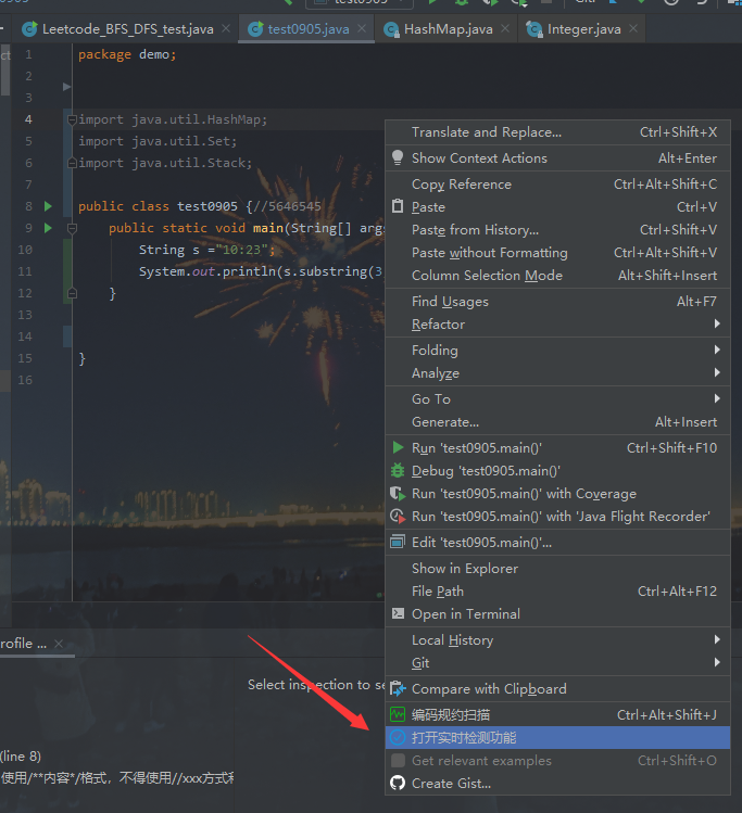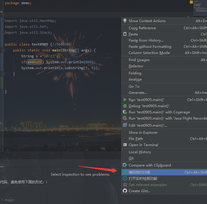 如果没有开启实时检测,只需要在需要检测的代码区内右击,选择编程规范扫描即可