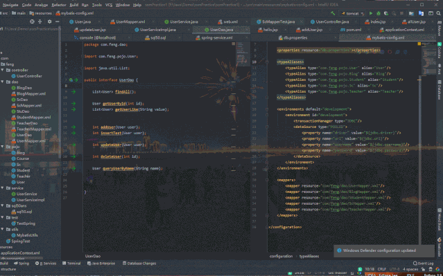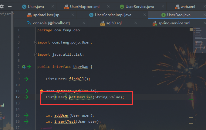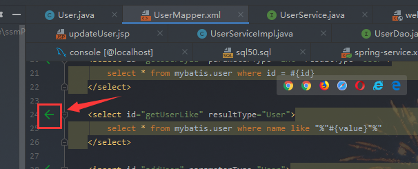 点绿色小箭头跳转到UserDao中的getUserLike,同样点接口中的箭头也能跳转回Mapper.xml文件