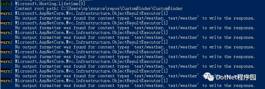 测试方法中定义 Produces("text/weather"),指定需要的 ContentType,同时,还需要将 WeatherOutputFormatter 添加到 OutputFormatters 中使用。