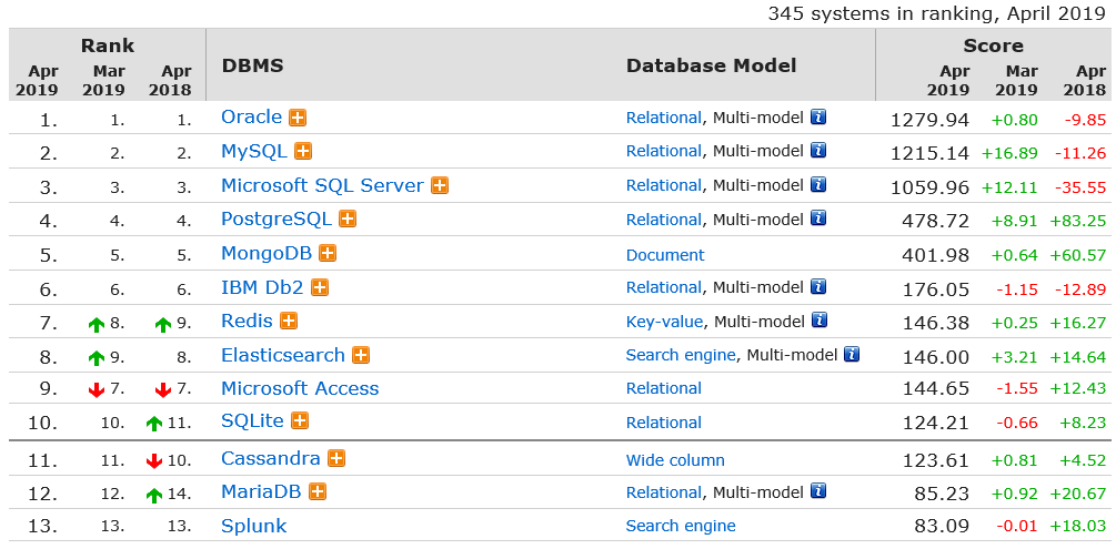 https://db-engines.com/en/ranking 点击查看各种数据度广度排名
