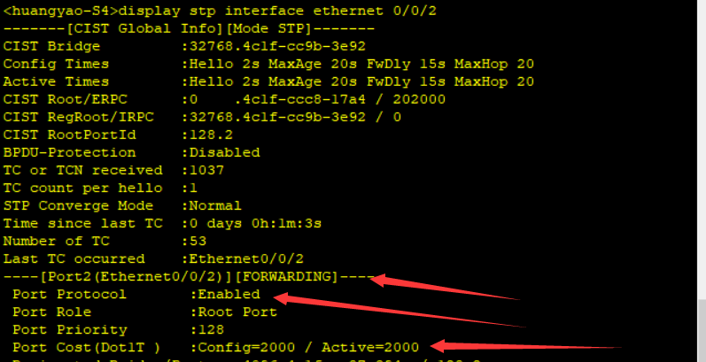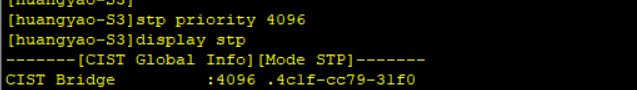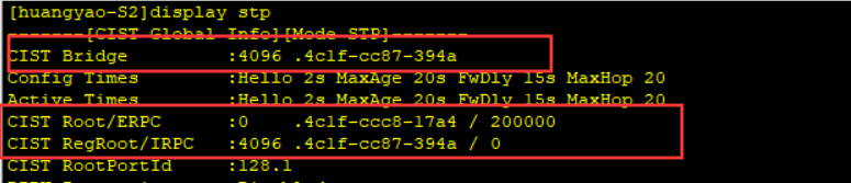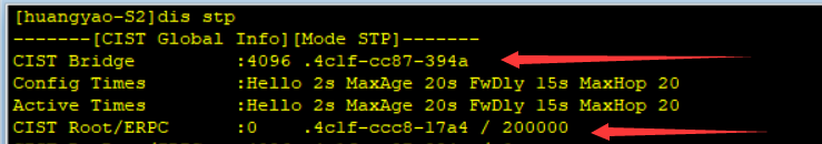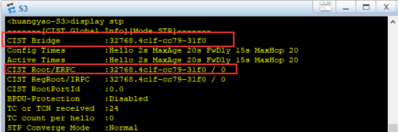 看到“CIST Root”和 “CIST Bridge”相同,即目前根交换机与自身的交换机ID相同,,说明S3为根交换机。