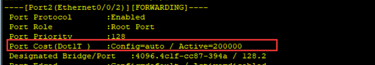 可以看到,,接口路径开销采用的是Dot1T的计算方法,,Config是指手工配置的路径开销,,Active是实际使用的路径开销,,开销值为1。