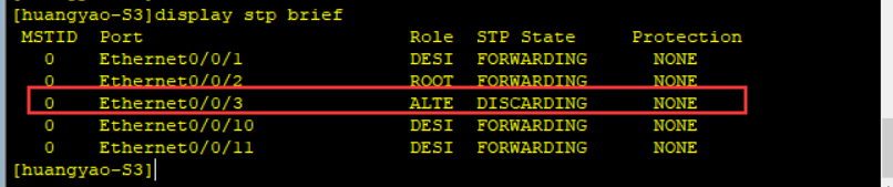 可以看到,即使将S3的优先级修改的比S2的优先级值更低,,但是S2的E 0/0/3接口仍然为指定端口,,而S3的E 0/0/3接口还是Alternate端口,,再次验证啦选举指定端口时首先比较根路径开销规则。