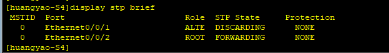 目前S1为主根交换机,而S2为备份根交换机,查看S4上生成树信息。