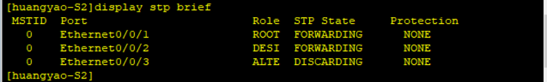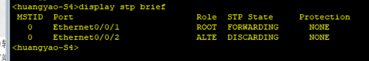 可以看到S1的E 0/0/1端口为丢弃状态、端口角色Alternate,即替代端口,,E 0/0/2端口为转发状态、端口角色为ROOT(根端口)。