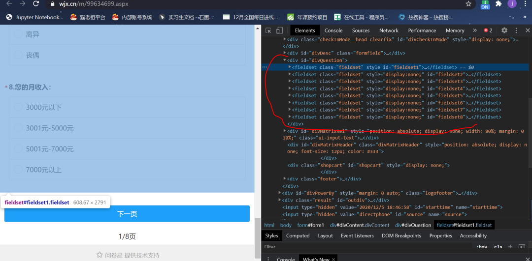 上图中是问题第一页,在这一页,查看源代码,发现问卷的 8 页的代码标签都在这了,所以不需要翻页去查看后面的问题了。