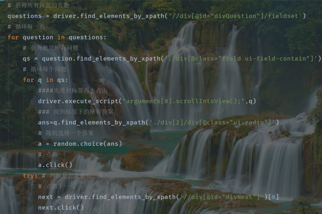 接下来就简单多了,问题就是提取所有页的标签,循环每一页标签,从每一页标签中提取每个问题,再随机选择答案,翻页,最后提交。