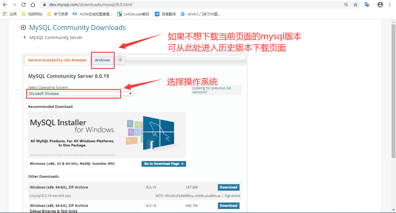 ②mysql官网所有版本下载地址:https://downloads.mysql.com/archives/community/