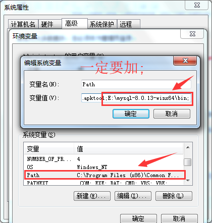 首先进行环境变量的配置:右击计算机->属性->高级系统设置->环境变量,选择双击Path,在最后面添加你的mysql bin文件夹的路径