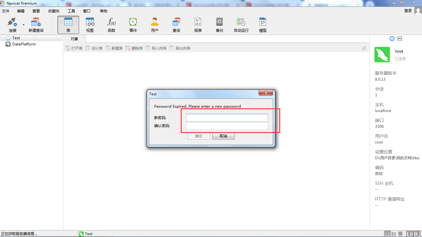 打开Navicat Premium,连接配置好的mysql数据库,第一次连接时会提示修改新密码