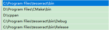 可以在 /bin 目录下找到 tesseract.exe 文件,将 C:\Program Files\tesseract\bin 添加到环境变量 path 中去(如何在 win10 上添加环境变量就不详细说明了,网上有许多教程)。此外,在 /bin 目录下新建两个文件夹 Debug 和 Release,分别将 D:\tesseract_4.1.0\build\bin\Debug 和 D:\tesseract_4.1.0\build\bin\Release 目录下的 .dll 文件复制到所新建的两个文件夹下去;然后将 C:\Program Files\tesseract\bin\Debug 和 C:\Program Files\tesseract\bin\Release 也添加到环境变量 path 中去,如下: