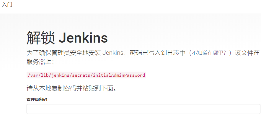 我们应该看到“解锁Jenkins”屏幕,显示初始密码的位置